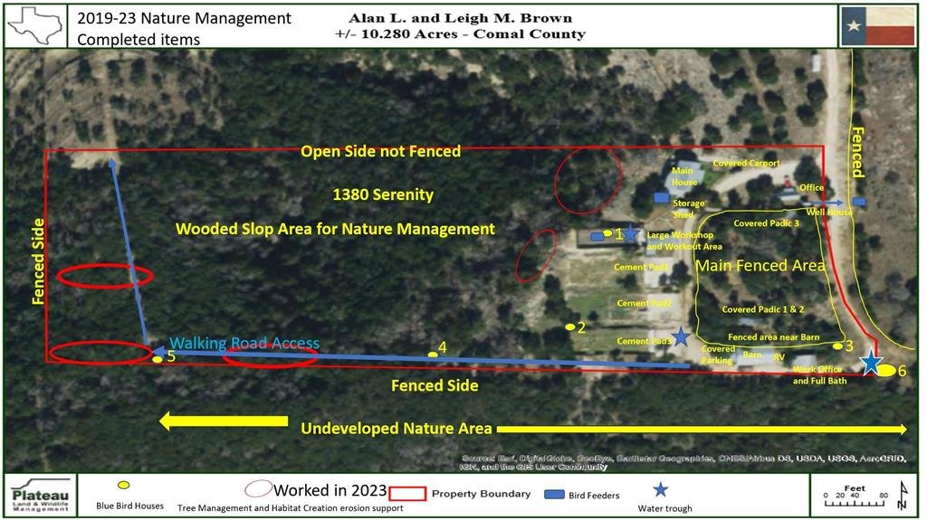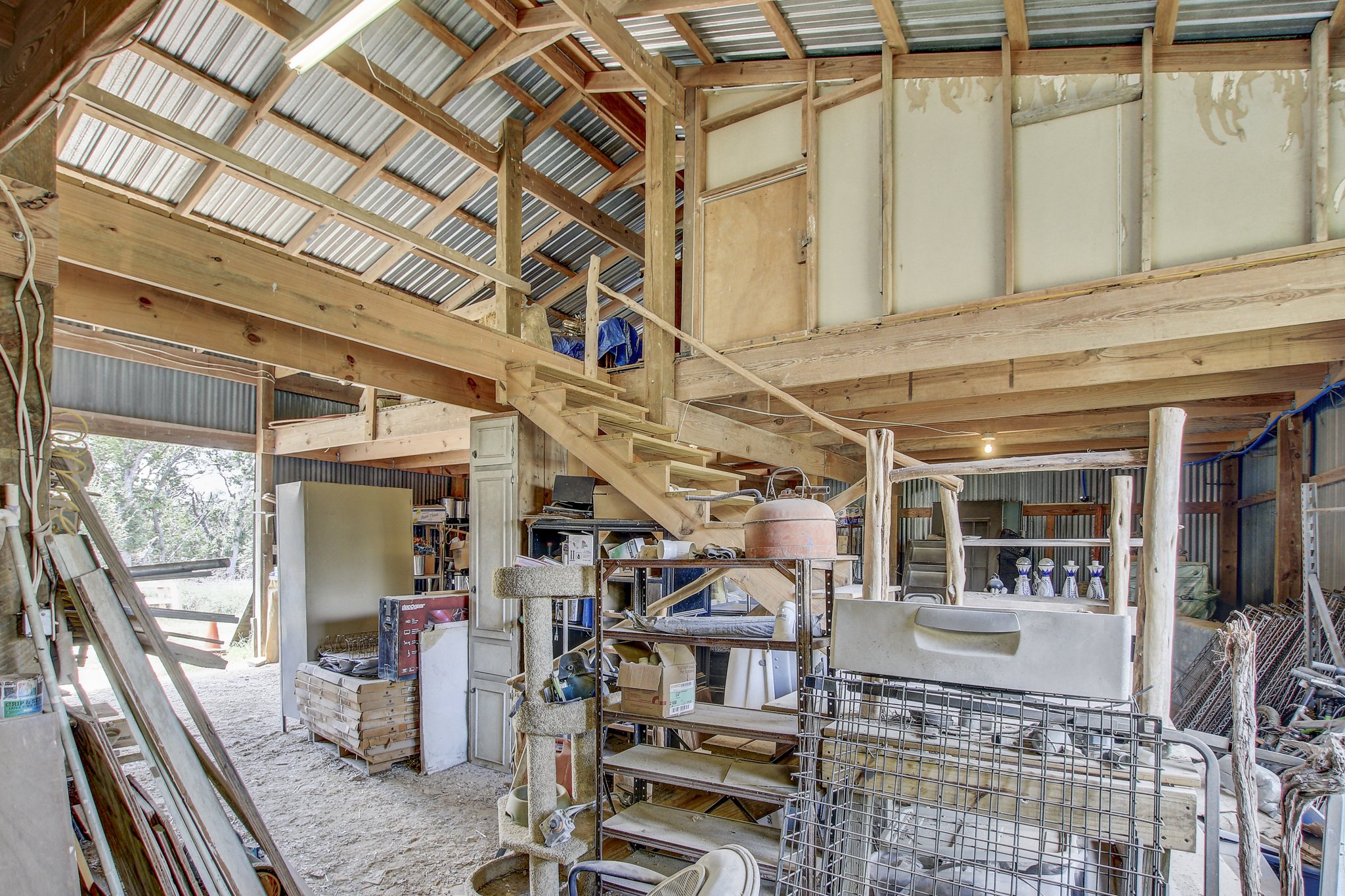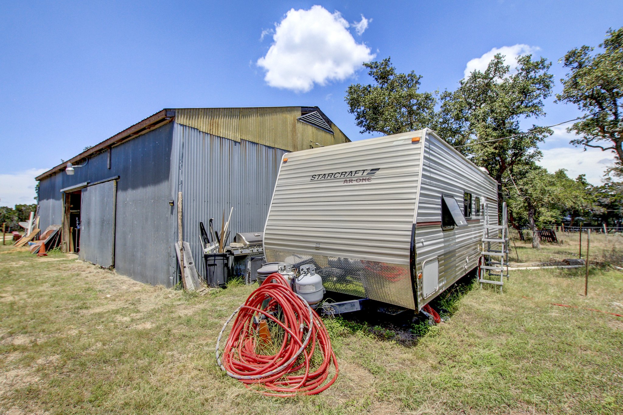 Includes 2 carports for car, truck or RV, storage unit, workshop with electricity(approx 20x45), barn with electricity(approx 60x45), Office with 2 rooms and fiber optic wifi/cable, and cottage with bathroom and kitchen. RV can convey and is fully functional, 23ft and sleeps 4-5 people. The 3 concrete slabs offer beautiful views w/ water/electric and area for adding septic capabilities. Nature Management tax exemption in place that can be turned into an Ag exemption with a barn w/pens & paddock enclosures.Property utilities include 2 water meters, 2 septic systems, a water well (2500 gal/800ft), gasoline backup generator, HVAC/water heater(approx 3 yrs old), Cable/wifi, Fiber Optic At&t, & DirectTV avail! NO RESTRICTIONS, so great location for Airbnb or VRBO rentals! Located in the 78623 neighborhood, this property offers a unique blend of seclusion and wildlife area.