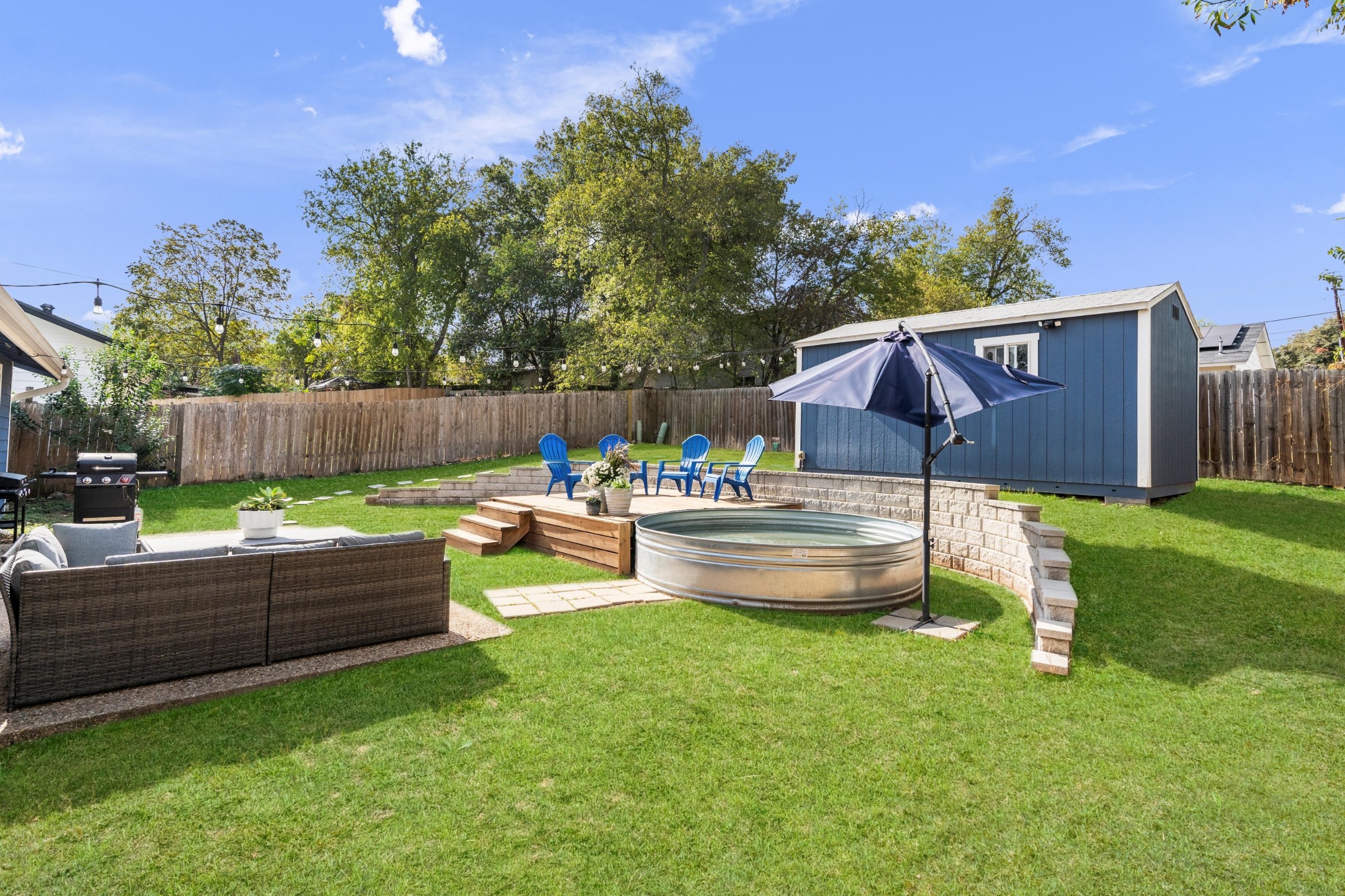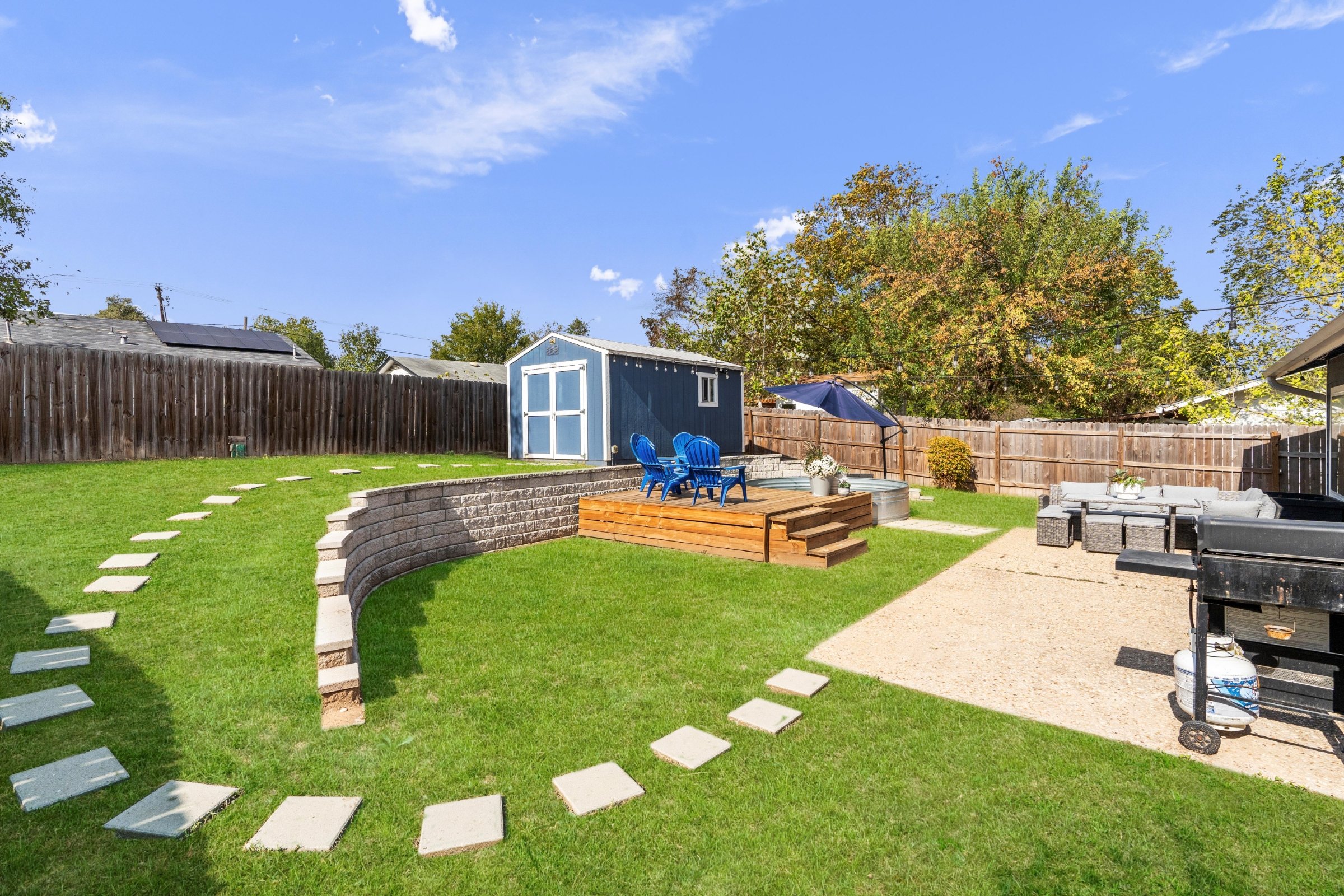 Large fenced backyard, wood deck surrounding a cowboy pool, French doors opening to a spacious back patio, custom shed outfitted as a bar, traditional ranch-style layout for privacy, close proximity to amenities and schools, abundant storage throughout the home
